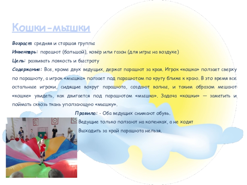 Содержание: Все, кроме двух ведущих, держат парашют за края. Игрок «кошка» ползает сверху по парашюту, а игрок «мышка» ползает под парашютом по кругу ближе к краю. В это время все остальные игроки, сидящие вокруг парашюта, создают волны, и таким образом мешают «кошке» увидеть, как двигается под парашютом «мышка». Задача «кошки» — заметить и поймать сквозь ткань уползающую «мышку».