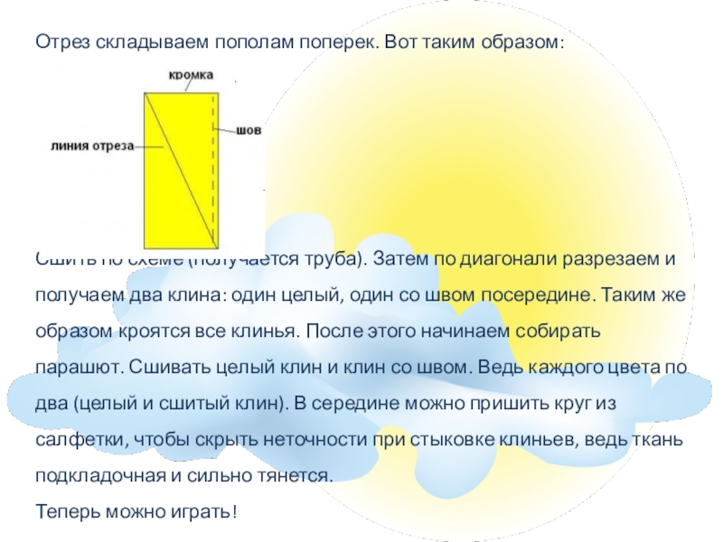 труба). Затем по диагонали разрезаем и получаем два клина: один целый, один со швом посередине. Таким же образом кроятся все клинья. После этого начинаем собирать парашют. Сшивать целый клин и клин со швом. Ведь каждого цвета по два (целый и сшитый клин). В середине можно пришить круг из салфетки, чтобы скрыть неточности при стыковке клиньев, ведь ткань подкладочная и сильно тянется.