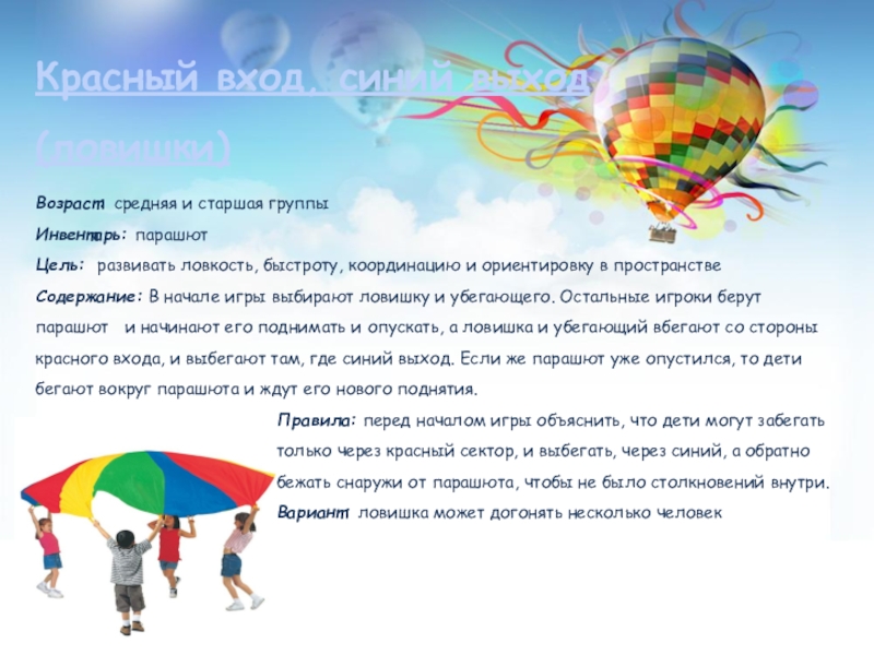 Содержание: В начале игры выбирают ловишку и убегающего. Остальные игроки берут парашют и начинают его поднимать и опускать, а ловишка и убегающий вбегают со стороны красного входа, и выбегают там, где синий выход. Если же парашют уже опустился, то дети бегают вокруг парашюта и ждут его нового поднятия.