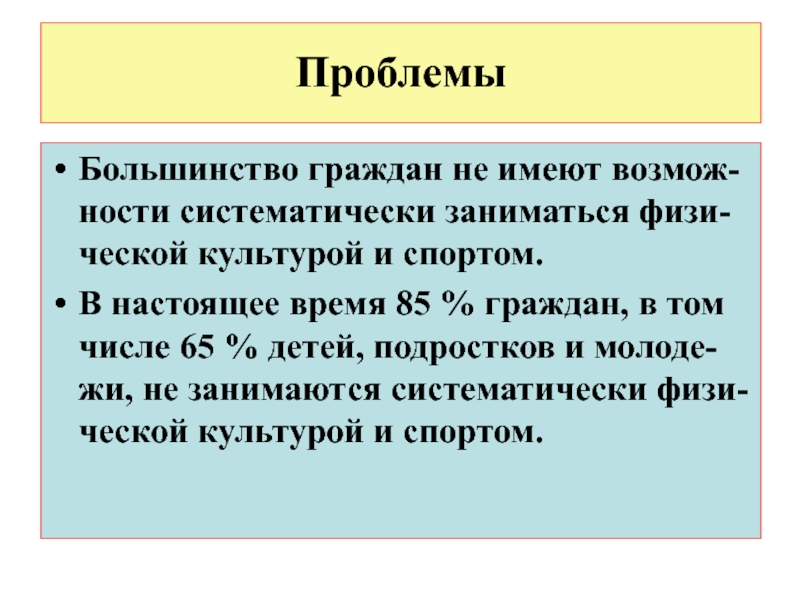 В настоящее время 85 % граждан, в том числе 65 % детей, подростков и молоде-жи, не занимаются систематически физи-ческой культурой и спортом.
