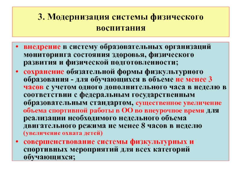сохранение обязательной формы физкультурного образования - для обучающихся в объеме не менее 3 часов с учетом одного дополнительного часа в неделю в соответствии с федеральным государственным образовательным стандартом, существенное увеличение объема спортивной работы в ОО во внеурочное время для реализации необходимого недельного объема двигательного режима не менее 8 часов в неделю (увеличение охвата детей)