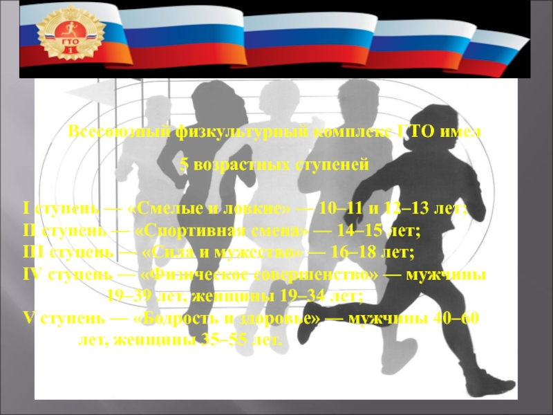 Всесоюзный физкультурный комплекс ГТО имел 5 возрастных ступенейI ступень — «Смелые и ловкие» — 10–11 и 12–13 лет;II