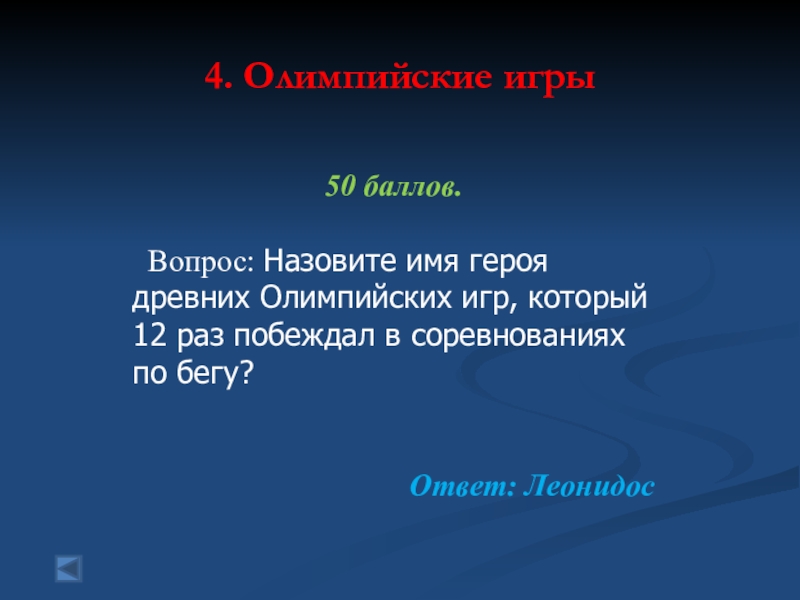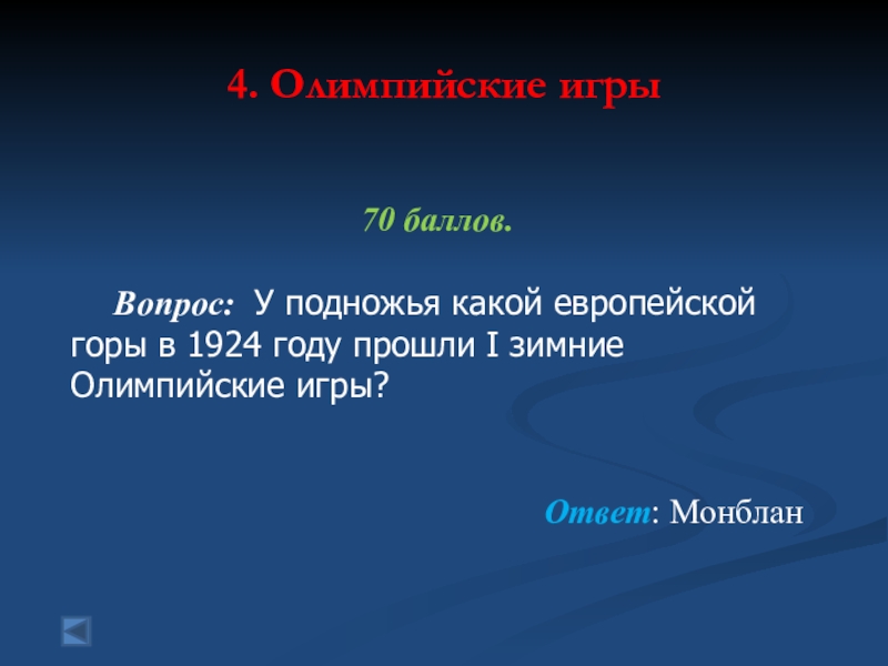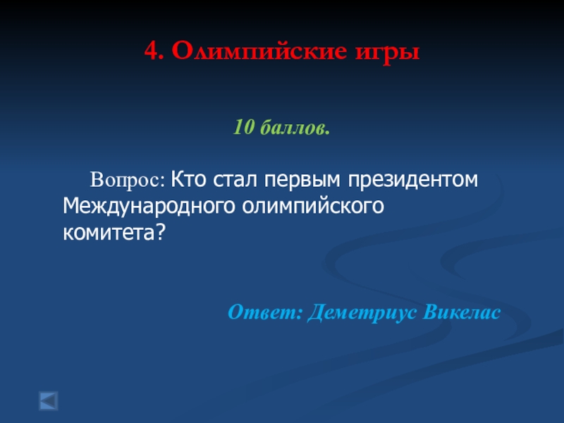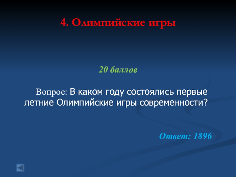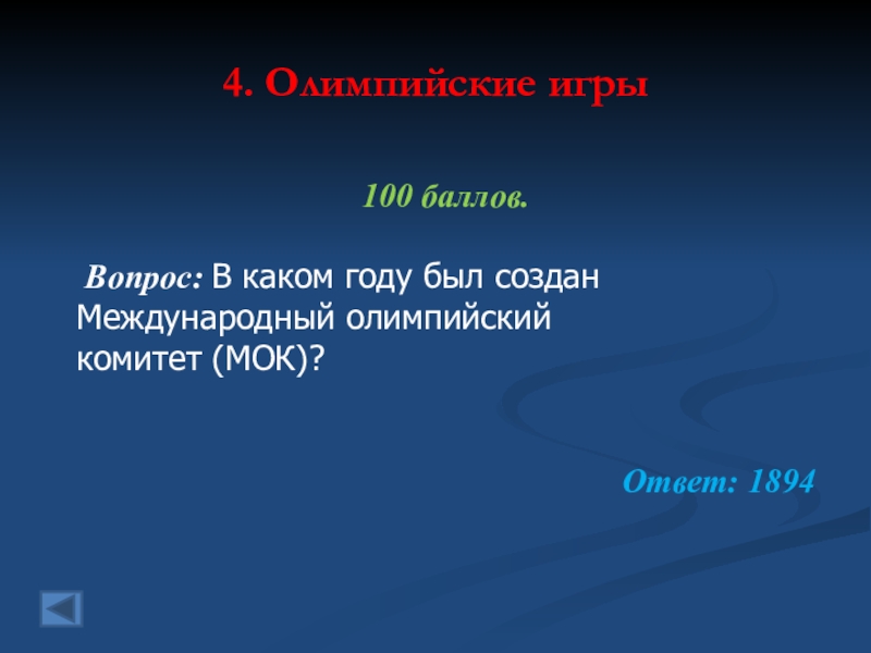 4. Олимпийские игры 100 баллов. Вопрос: В каком году был созданМеждународный олимпийскийкомитет (МОК)?Ответ: 1894