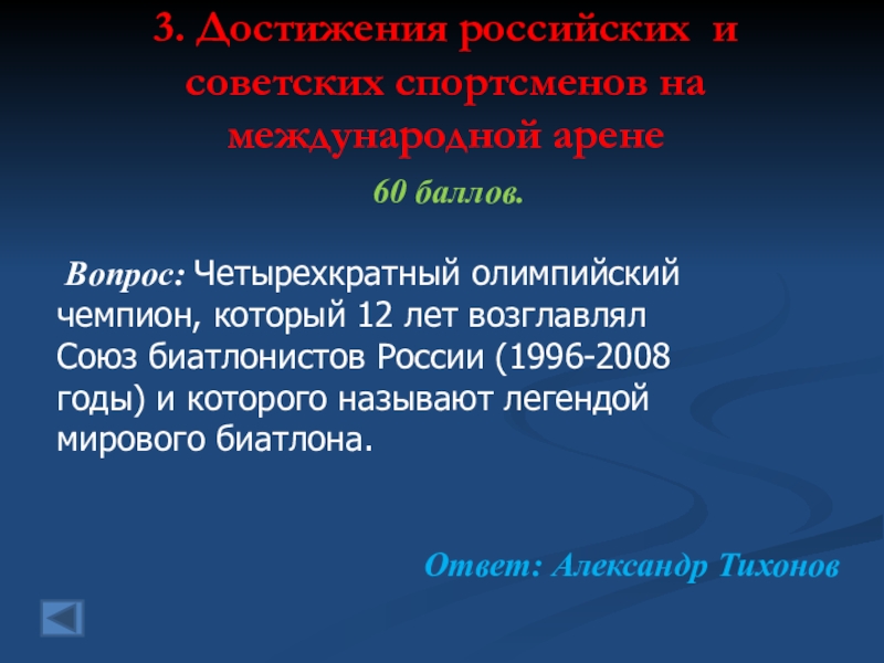 3. Достижения российских и советских спортсменов на международной арене  60 баллов. Вопрос: Четырехкратный олимпийскийчемпион, который 12
