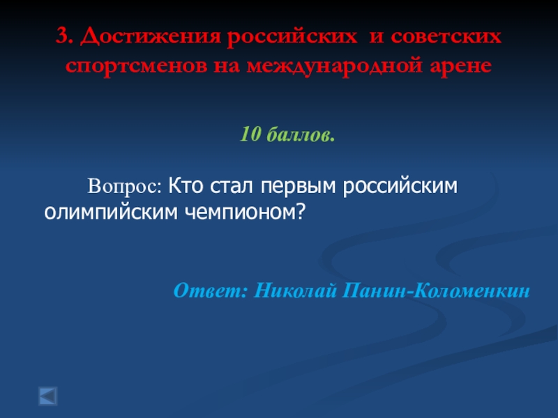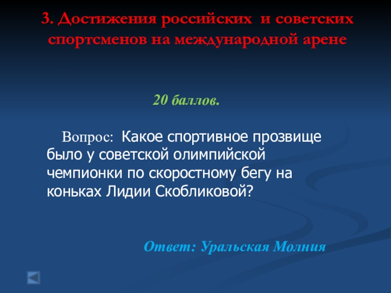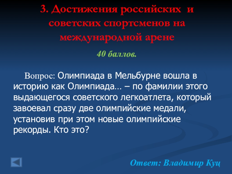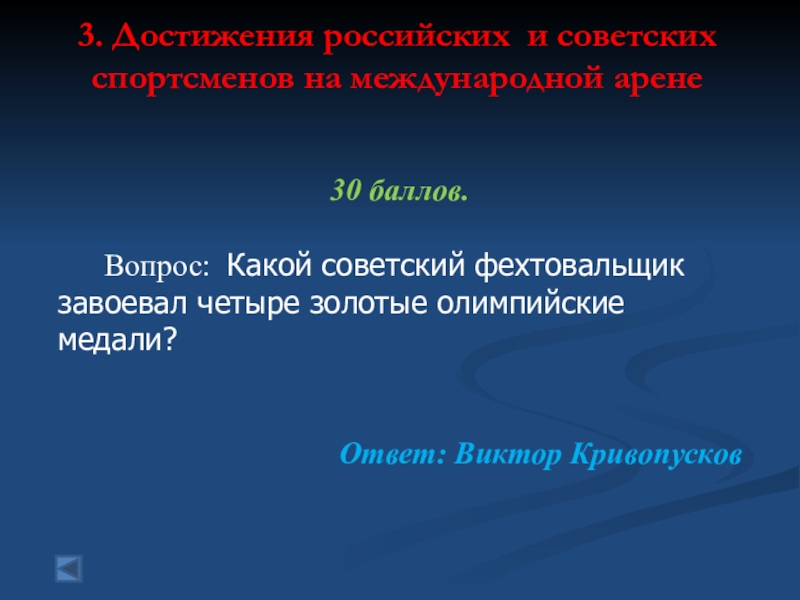 3. Достижения российских и советских спортсменов на международной арене  80 баллов. Вопрос: Вид спорта, в котором