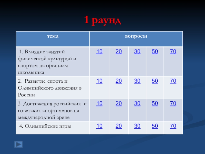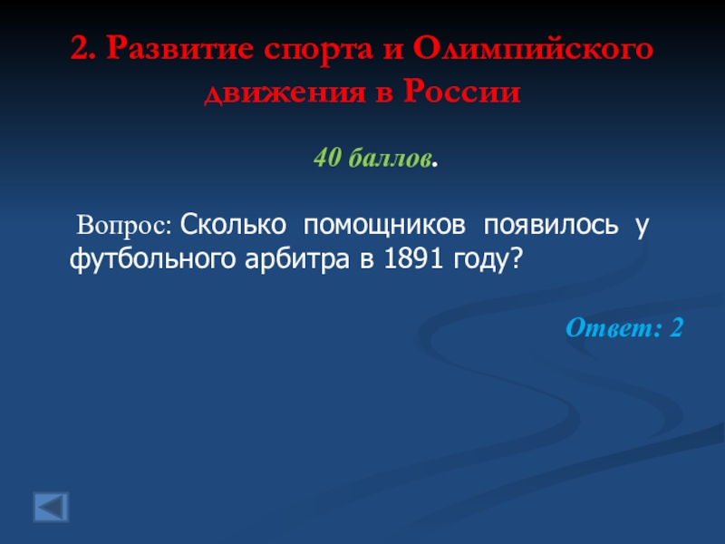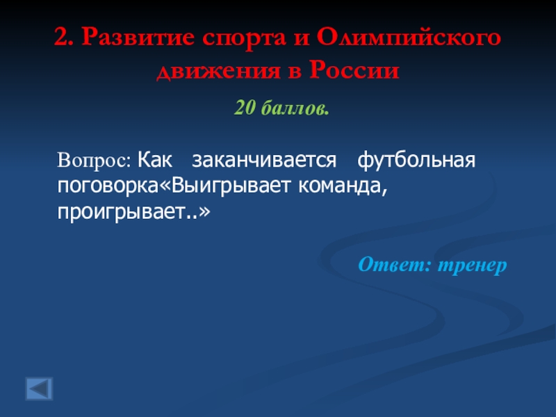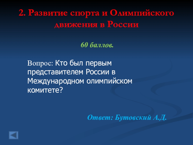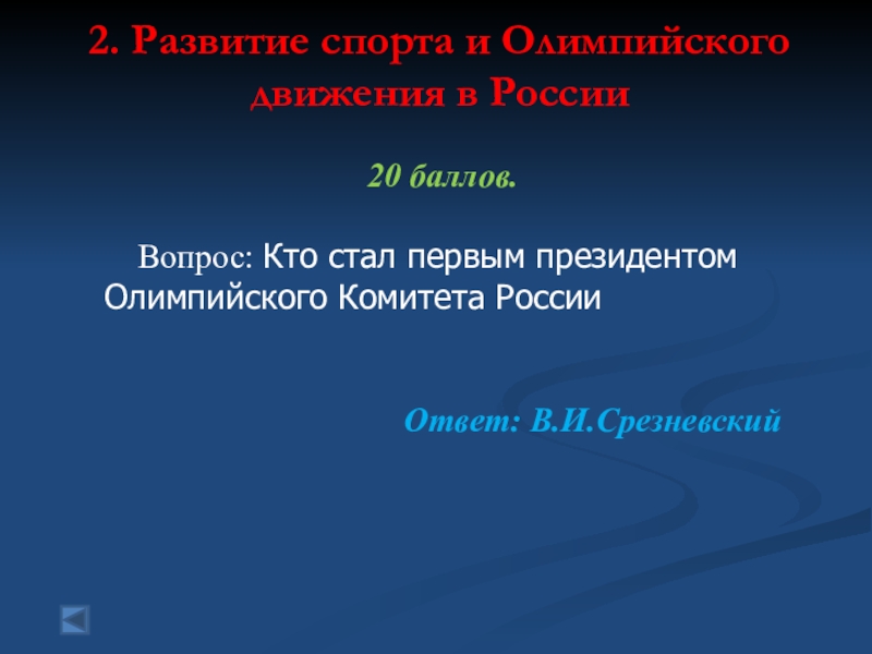 2. Развитие спорта и Олимпийского движения в России  20 баллов.   Вопрос: Кто стал первым