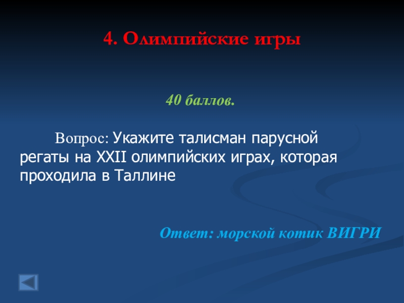 4. Олимпийские игры 40 баллов.     Вопрос: Укажите талисман паруснойрегаты на XXII олимпийских играх,