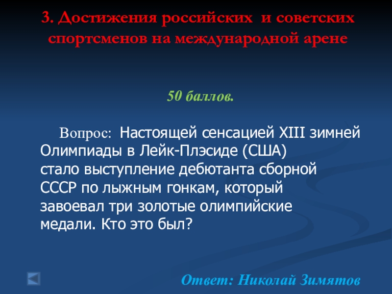 3. Достижения российских и советских спортсменов на международной арене   50 баллов.   Вопрос: Настоящей