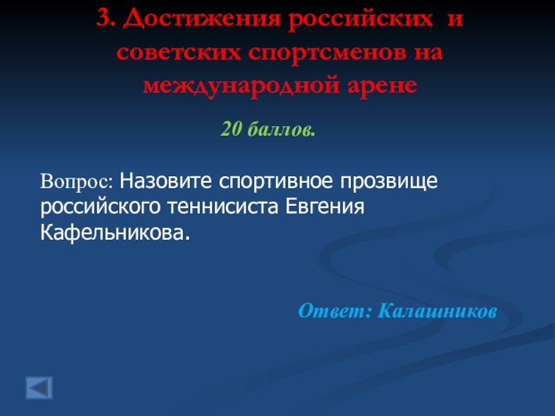 3. Достижения российских и советских спортсменов на международной арене  20 баллов. Вопрос: Назовите спортивное прозвищероссийского теннисиста