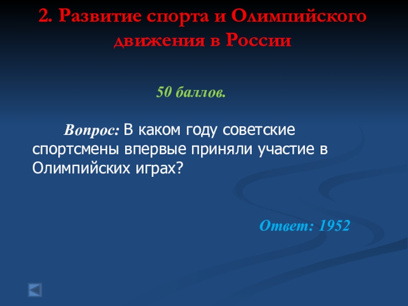 2. Развитие спорта и Олимпийского движения в России  50 баллов.    Вопрос: В каком