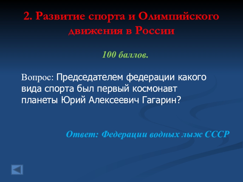 2. Развитие спорта и Олимпийского движения в России 100 баллов. Вопрос: Председателем федерации какоговида спорта был первый