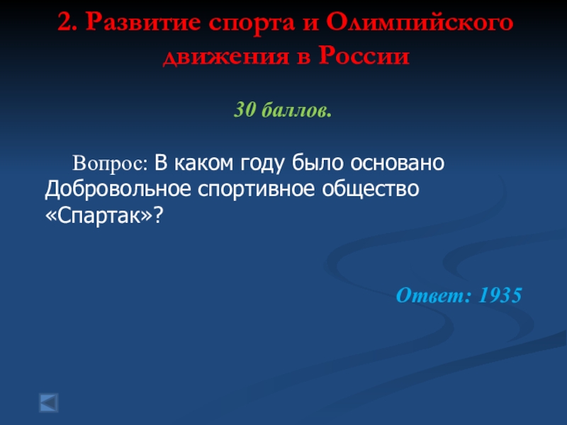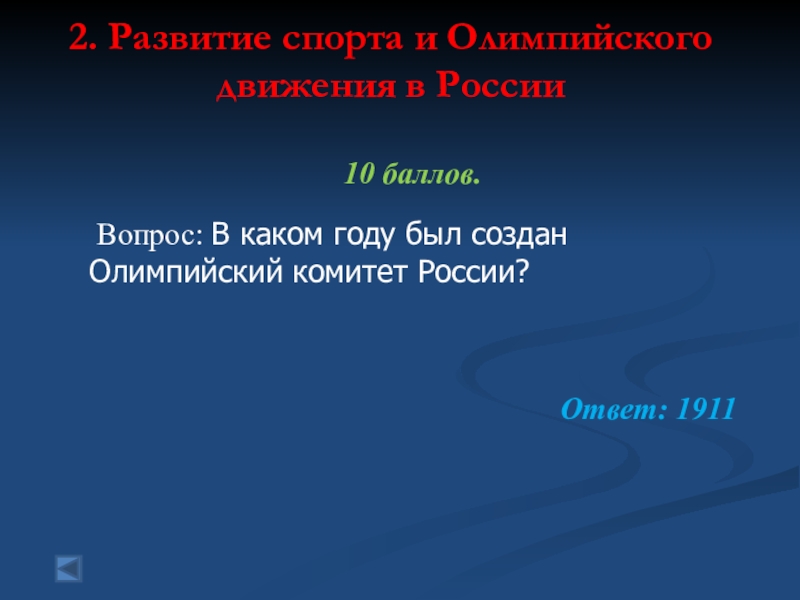 2. Развитие спорта и Олимпийского движения в России  10 баллов. Вопрос: В каком году был созданОлимпийский