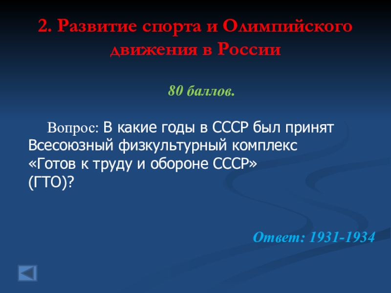 2. Развитие спорта и Олимпийского движения в России 80 баллов.   Вопрос: В какие годы в