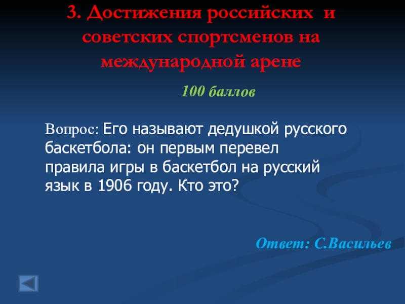 3. Достижения российских и советских спортсменов на международной арене   100 балловВопрос: Его называют дедушкой русскогобаскетбола:
