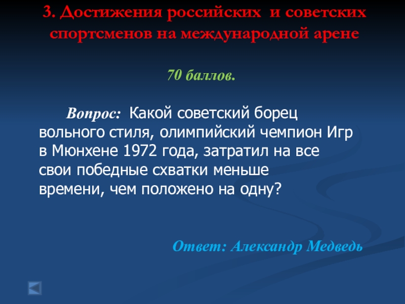 3. Достижения российских и советских спортсменов на международной арене   70 баллов.    Вопрос: