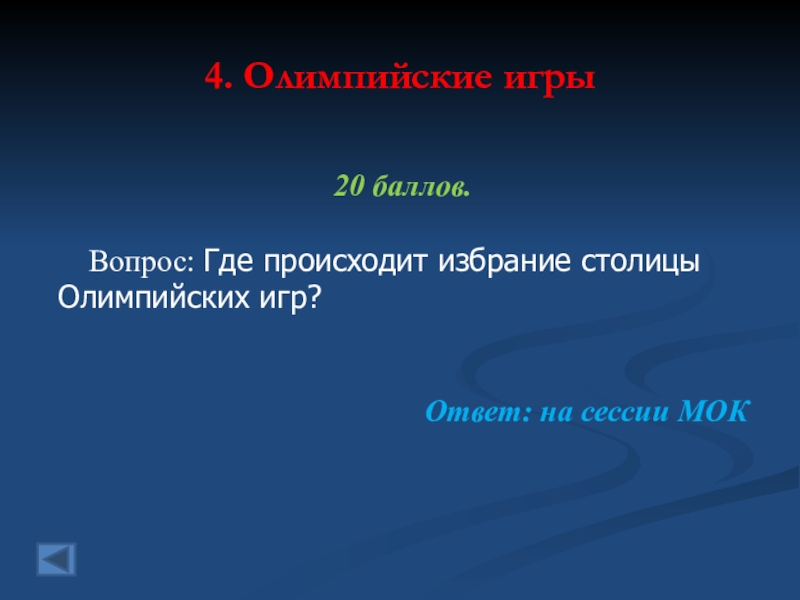 4. Олимпийские игры 20 баллов.   Вопрос: Где происходит избрание столицыОлимпийских игр?Ответ: на сессии МОК