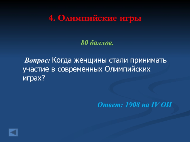 4. Олимпийские игры 80 баллов. Вопрос: Когда женщины стали приниматьучастие в современных Олимпийскихиграх?Ответ: 1908 на IV ОИ