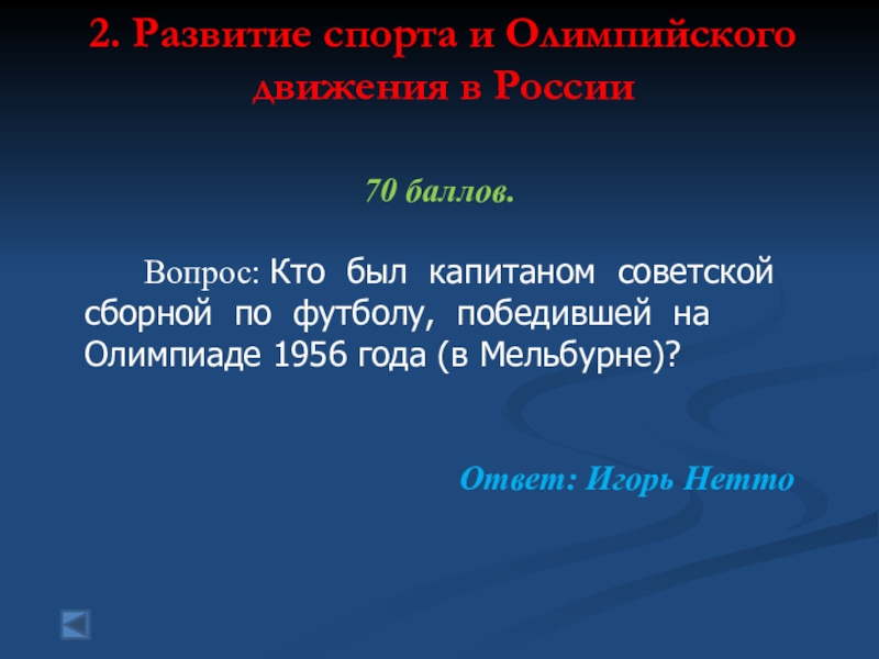2. Развитие спорта и Олимпийского движения в России  70 баллов.    Вопрос: Кто был