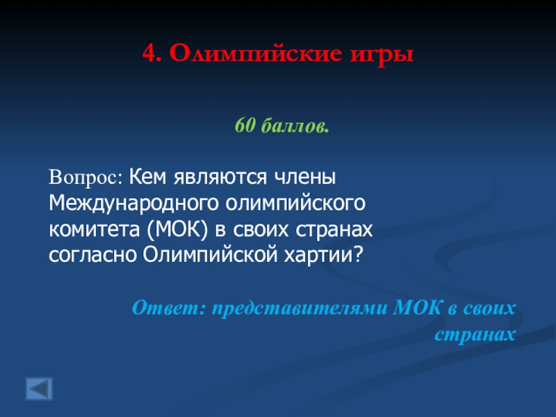 4. Олимпийские игры 60 баллов. Вопрос: Кем являются членыМеждународного олимпийскогокомитета (МОК) в своих странахсогласно Олимпийской хартии?Ответ: представителями