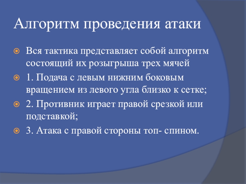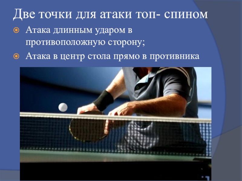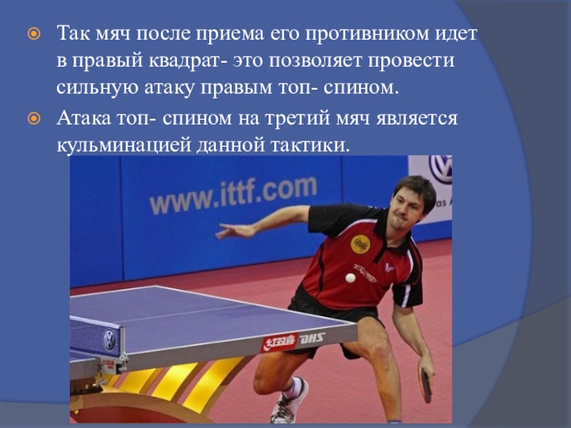 Атака топ- спином на третий мяч является кульминацией данной тактики.