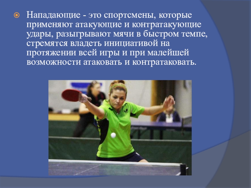 Слайд 14Нападающие - это спортсмены, которые применяют атакующие и контратакующие удары, разыгрывают