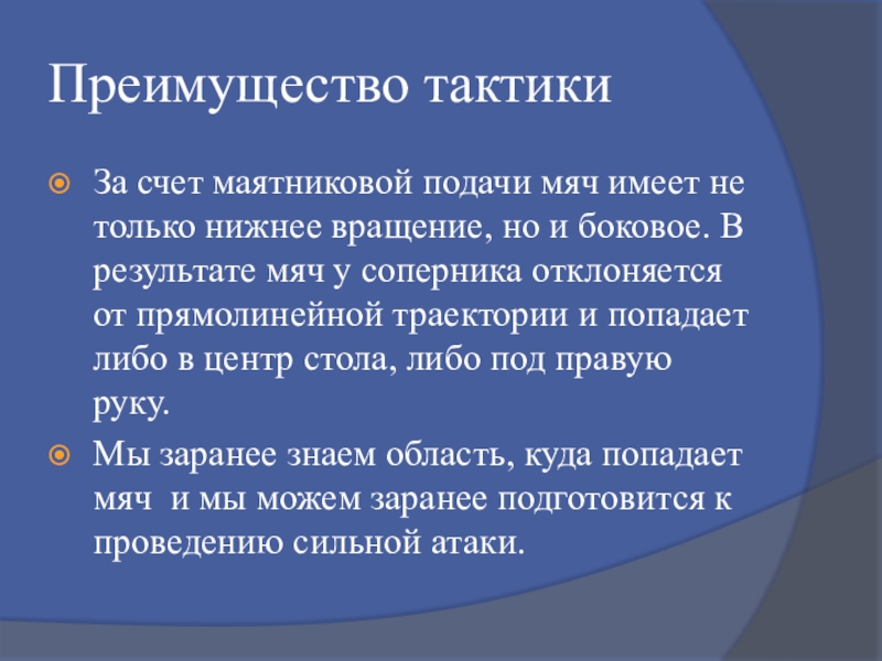 но и боковое. В результате мяч у соперника отклоняется от прямолинейной траектории и попадает либо в центр стола, либо под правую руку.