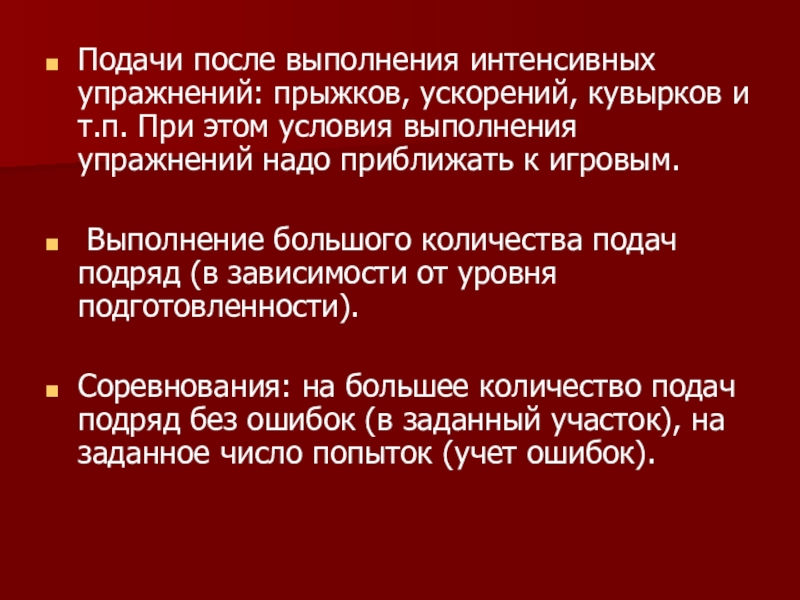 Слайд 8Подачи после выполнения интенсивных упражнений: прыжков, ускорений, кувырков и т.п. При