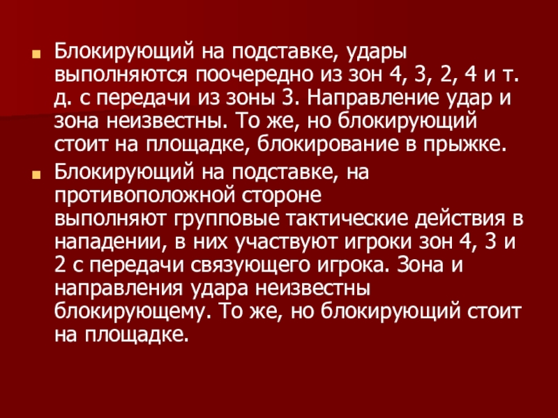 Слайд 14Блокирующий на подставке, удары выполняются поочередно из зон 4, 3, 2,