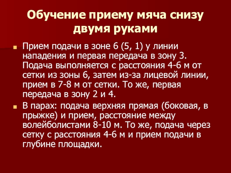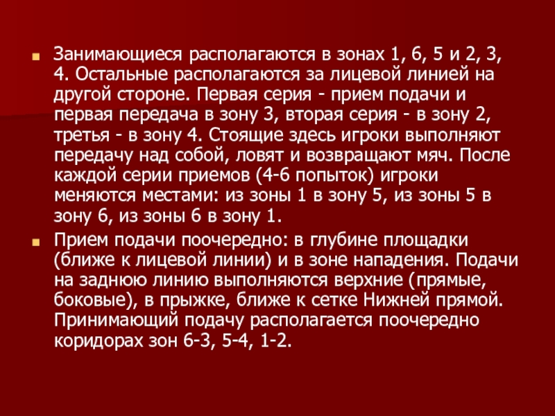 1) у линии нападения и первая передача в зону 3. Подача выполняется с расстояния 4-6 м от сетки из зоны 6, затем из-за лицевой линии, прием в 7-8 м от сетки. То же, первая передача в зону 2 и 4.