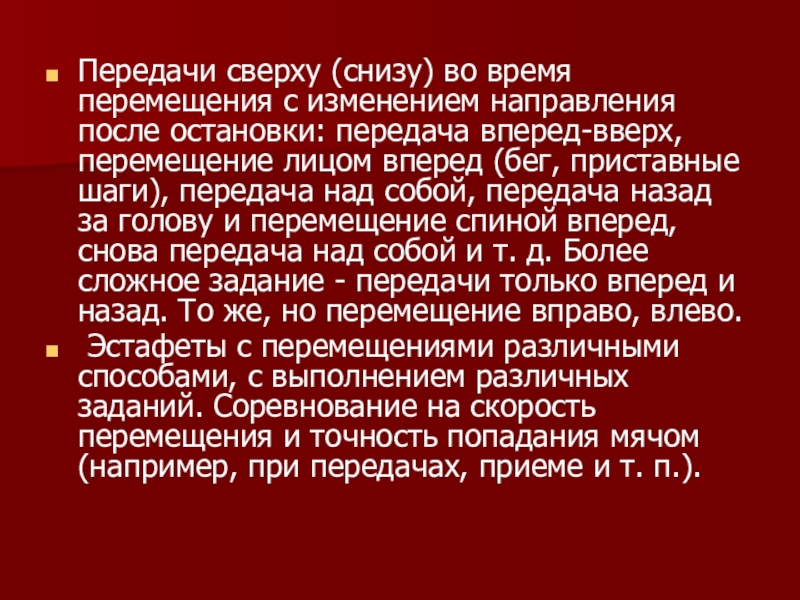 Передача сверху (снизу) двумя руками над собой и перемещение различными способами, остановки.