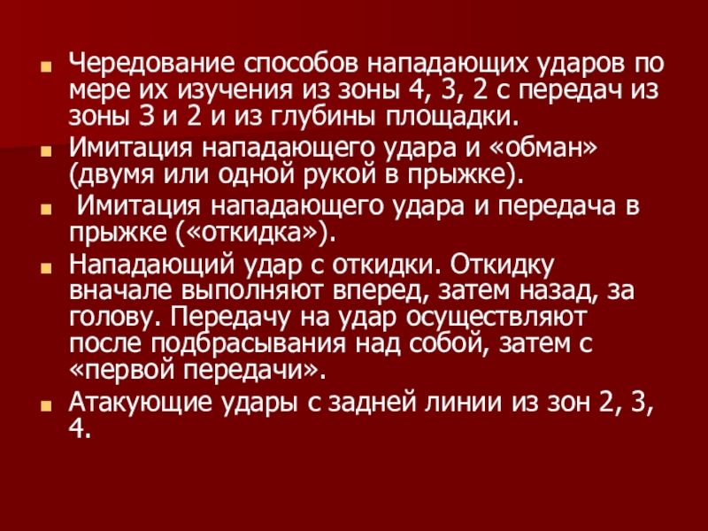 Слайд 10Чередование способов нападающих ударов по мере их изучения из зоны 4,