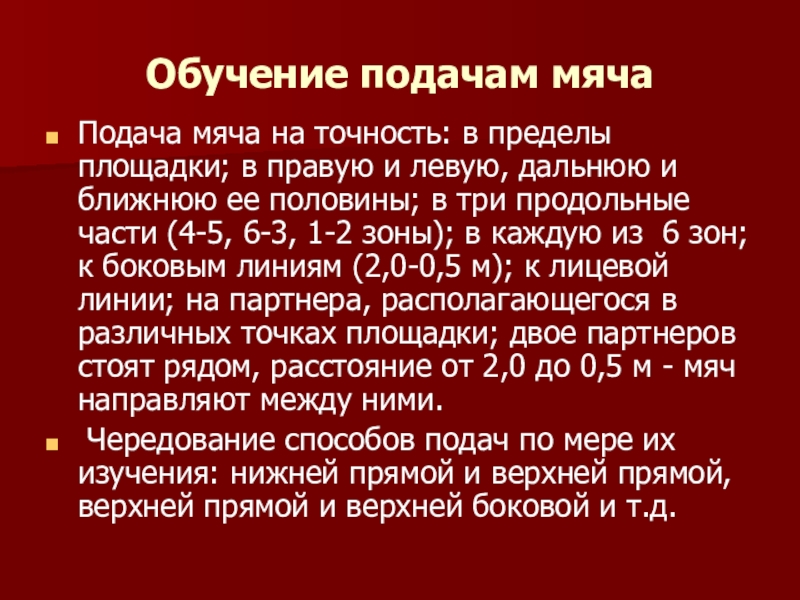Чередование способов подач по мере их изучения: нижней прямой и верхней прямой, верхней прямой и верхней боковой и т.д.