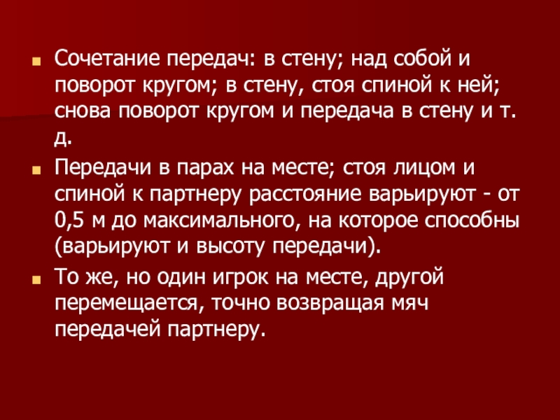 Передачи в парах на месте; стоя лицом и спиной к партнеру расстояние варьируют - от 0,5 м до максимального, на которое способны (варьируют и высоту передачи).