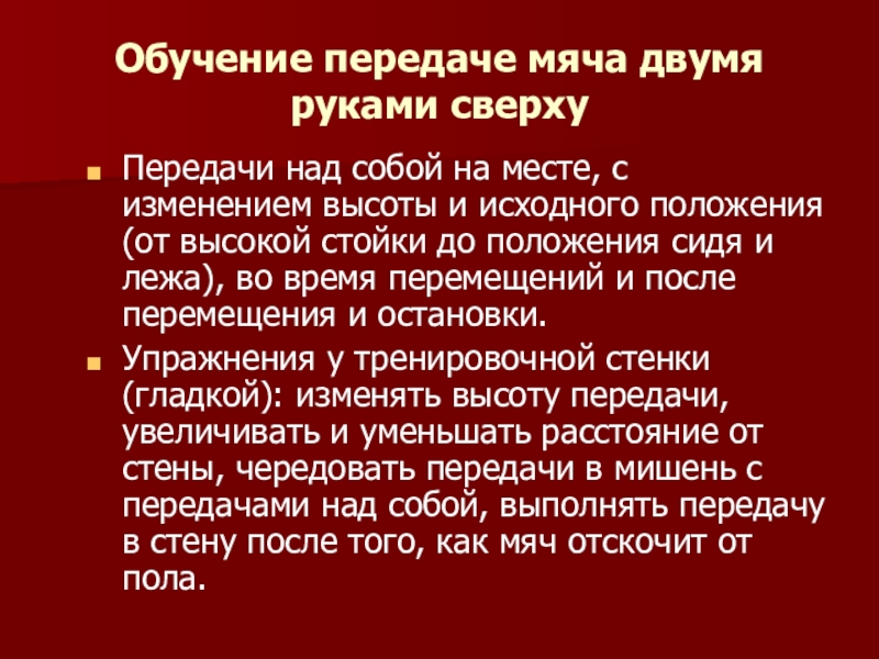 Упражнения у тренировочной стенки (гладкой): изменять высоту передачи, увеличивать и уменьшать расстояние от стены, чередовать передачи в мишень с передачами над собой, выполнять передачу в стену после того, как мяч отскочит от пола.