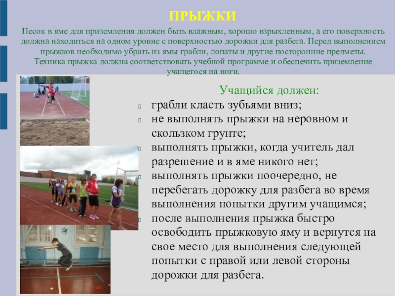 Песок в яме для приземления должен быть влажным, хорошо взрыхленным, а его поверхность должна находиться на одном уровне с поверхностью дорожки для разбега. Перед выполнением прыжков необходимо убрать из ямы грабли, лопаты и другие посторонние предметы.
