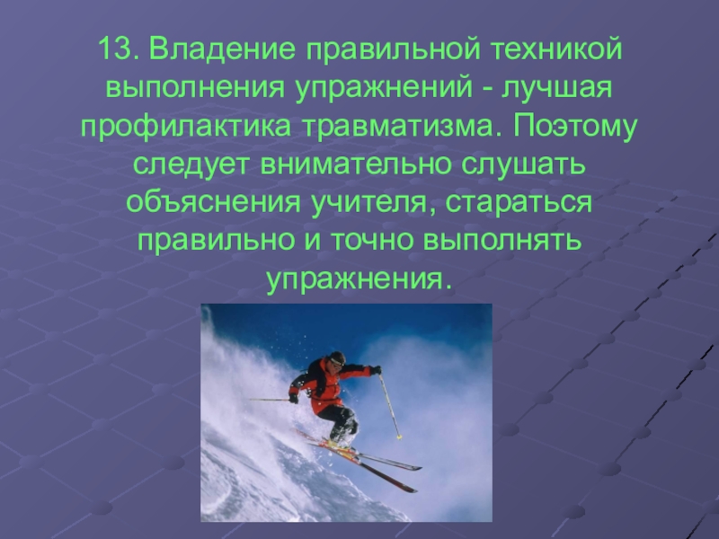 13. Владение правильной техникой выполнения упражнений - лучшая профилактика травматизма. Поэтому