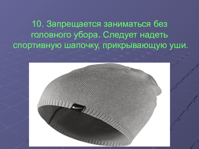 10. Запрещается заниматься без головного убора. Следует надеть спортивную шапочку, прикрывающую