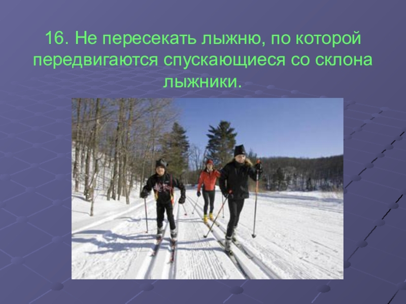 16. Не пересекать лыжню, по которой передвигаются спускающиеся со склона лыжники.
