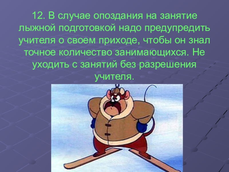 12. В случае опоздания на занятие лыжной подготовкой надо предупредить учителя