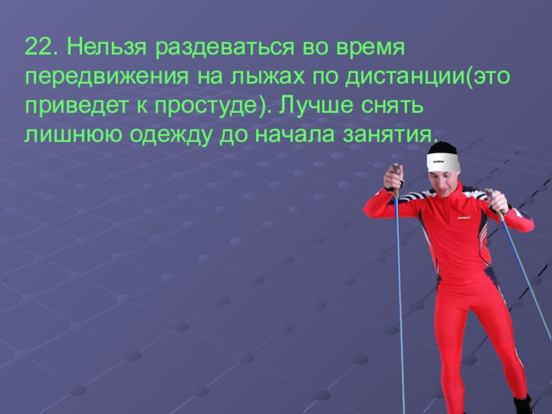 Слайд 2322. Нельзя раздеваться во время передвижения на лыжах по дистанции(это приведет
