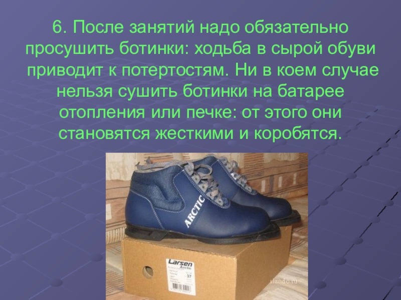 6. После занятий надо обязательно просушить ботинки: ходьба в сырой обуви