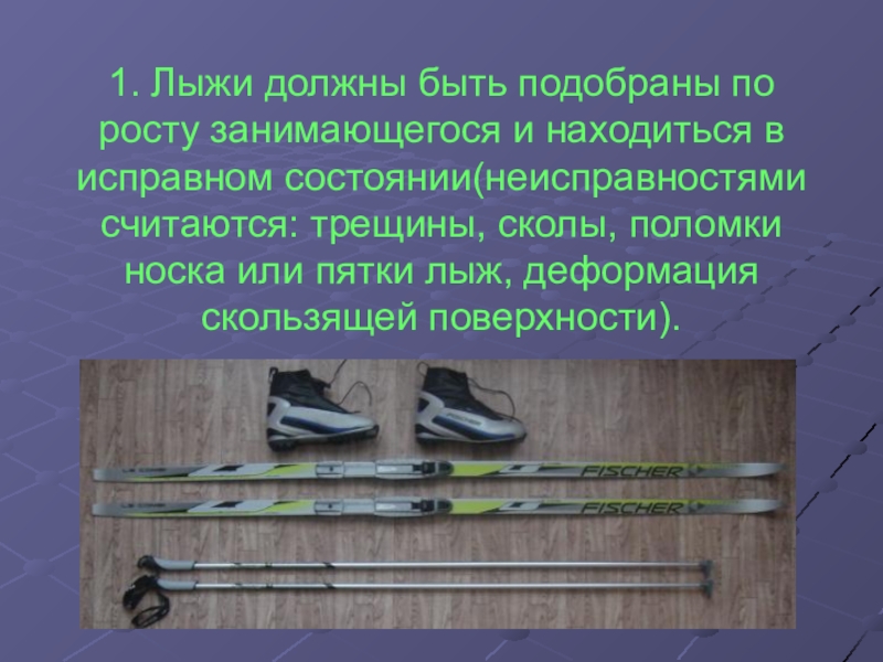 1. Лыжи должны быть подобраны по росту занимающегося и находиться в