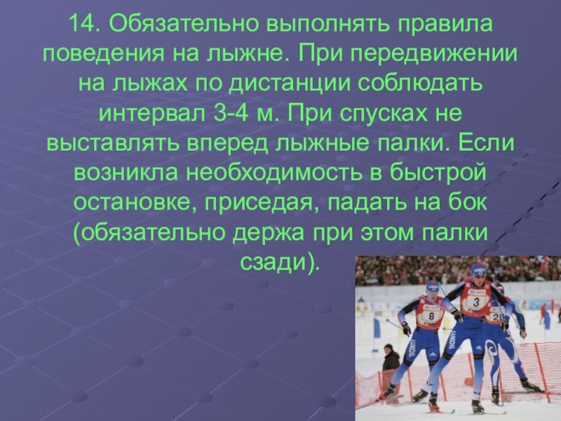 14. Обязательно выполнять правила поведения на лыжне. При передвижении на лыжах