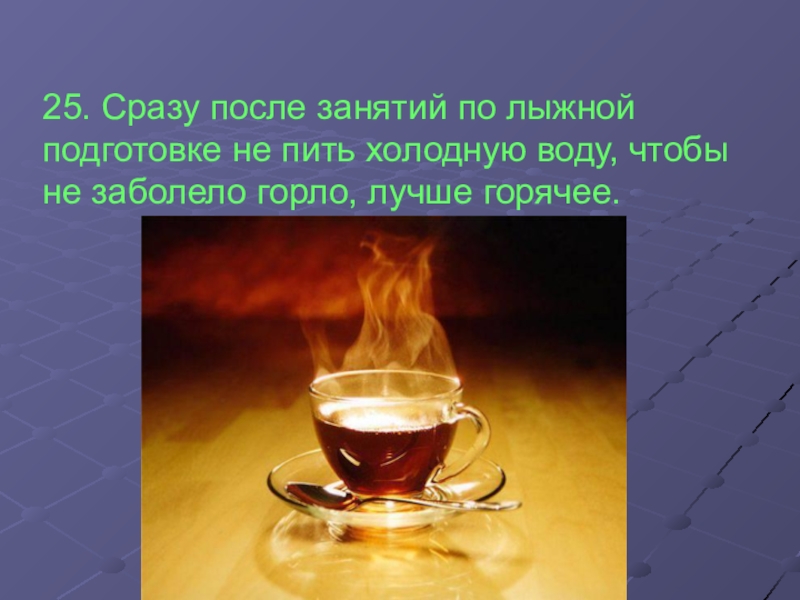 Слайд 2625. Сразу после занятий по лыжной подготовке не пить холодную воду,