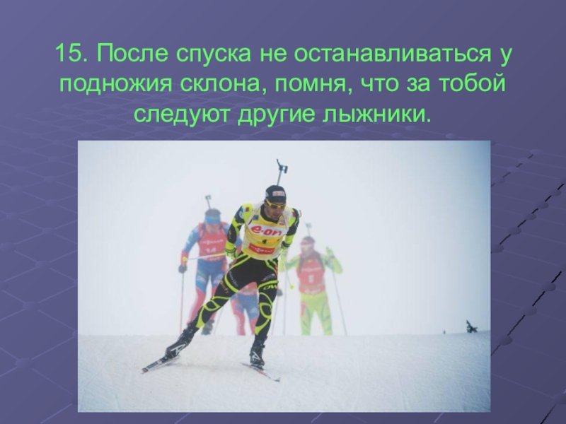 15. После спуска не останавливаться у подножия склона, помня, что за