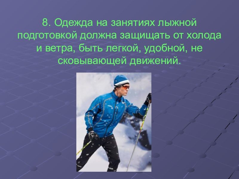 8. Одежда на занятиях лыжной подготовкой должна защищать от холода и