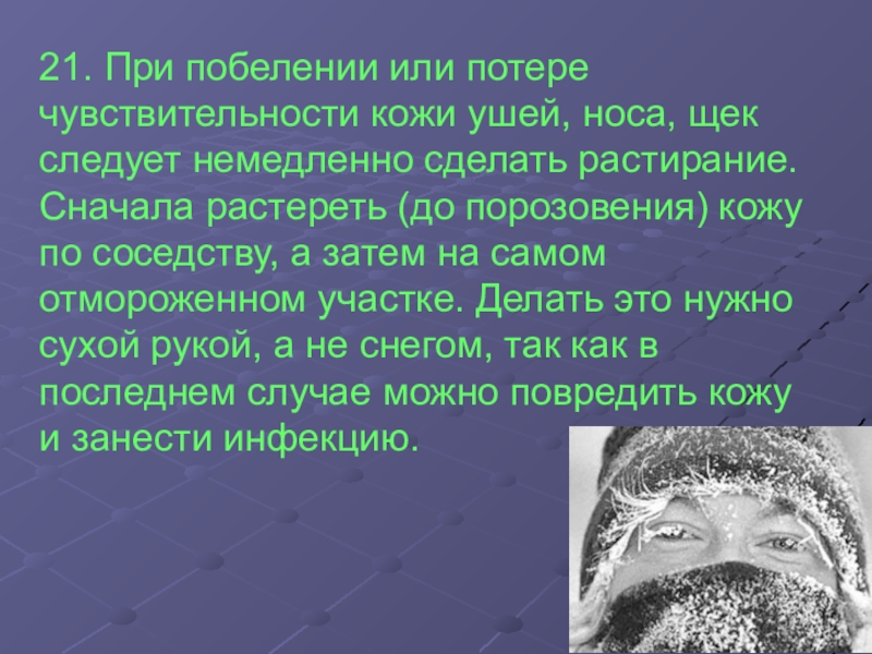 Слайд 2221. При побелении или потере чувствительности кожи ушей, носа, щек следует