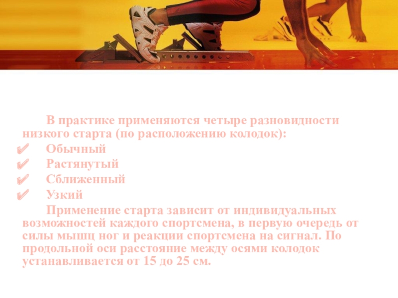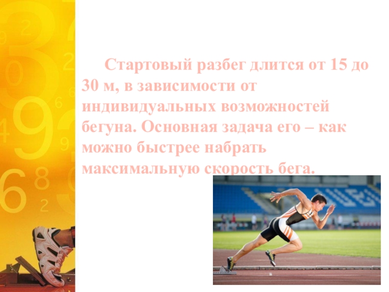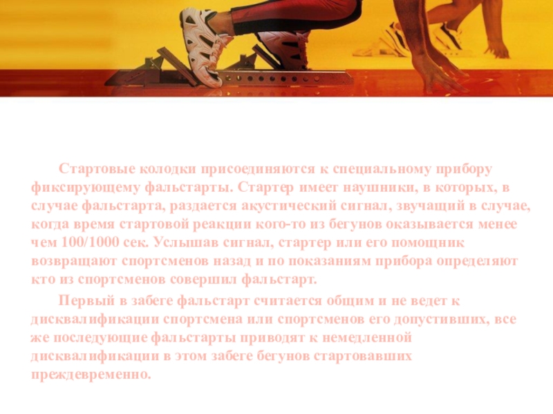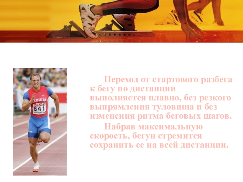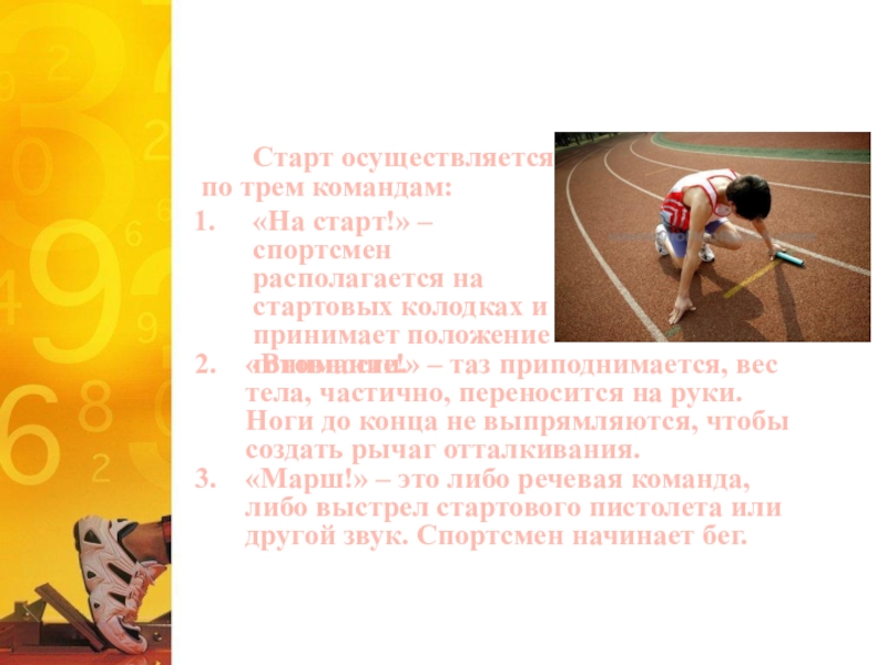 «Марш!» – это либо речевая команда, либо выстрел стартового пистолета или другой звук. Спортсмен начинает бег.