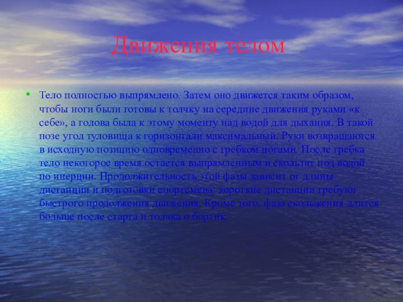 были готовы к толчку на середине движения руками «к себе», а голова была к этому моменту над водой для дыхания. В такой позе угол туловища к горизонтали максимальный. Руки возвращаются в исходную позицию одновременно с гребком ногами. После гребка тело некоторое время остается выпрямленным и скользит под водой по инерции. Продолжительность этой фазы зависит от длины дистанции и подготовки спортсмена: короткие дистанции требуют быстрого продолжения движения. Кроме того, фаза скольжения длится больше после старта и толчка о бортик.