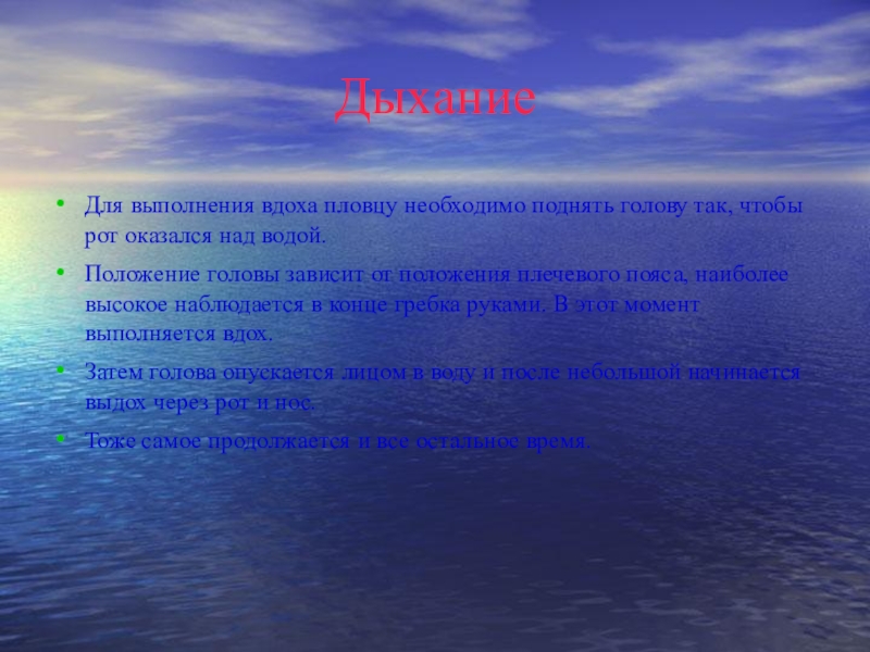 Дыхание Для выполнения вдоха пловцу необходимо поднять голову так, чтобы рот оказался над водой.Положение головы зависит от